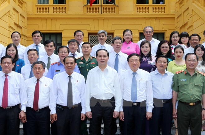Chủ tịch nước Trần Đại Quang với các đồng chí lãnh đạo của Tòa án Nhân dân Tối caoCùng dự buổi làm việc có các đồng chí Ủy viên Trung ương Đảng: Phan Đình Trạc, Trưởng ban Nội chính Trung ương; Lê Thị Nga, Chủ nhiệm Ủy ban Tư pháp của Quốc hội; đại diện lãnh đạo Bộ Công an, Viện Kiểm sát nhân dân tối cao.