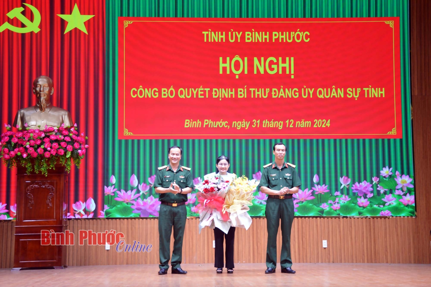 Thay mặt Thường trực Tỉnh ủy, Phó Bí thư Thường trực Tỉnh ủy Huỳnh Thị Hằng trao quyết định Bí thư Đảng ủy Quân sự tỉnh cho Bí thư Tỉnh ủy Tôn Ngọc Hạnh