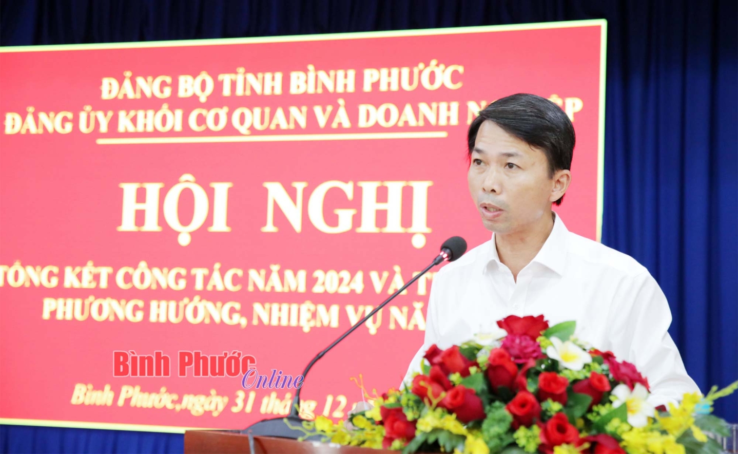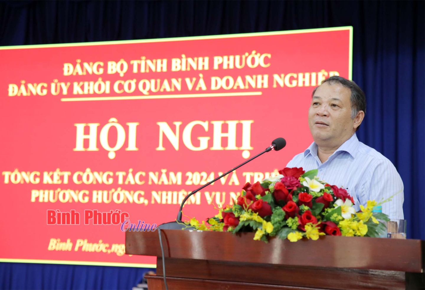 Phó Bí thư Thường trực Đảng ủy Khối Cơ quan và Doanh nghiệp tỉnh Nguyễn Phúc Bảy phát biểu tại hội nghị