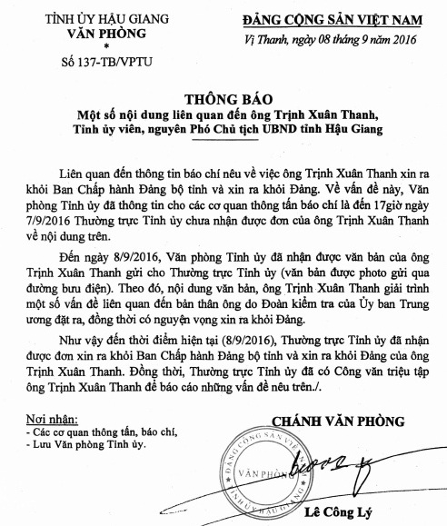 Văn bản cho biết, ngày 8-9-2016, Văn phòng Tỉnh ủy Hậu Giang đã nhận được văn bản của đồng chí Trịnh Xuân Thanh gửi cho Thường trực Tỉnh ủy (văn bản được photo gửi qua đường bưu điện).