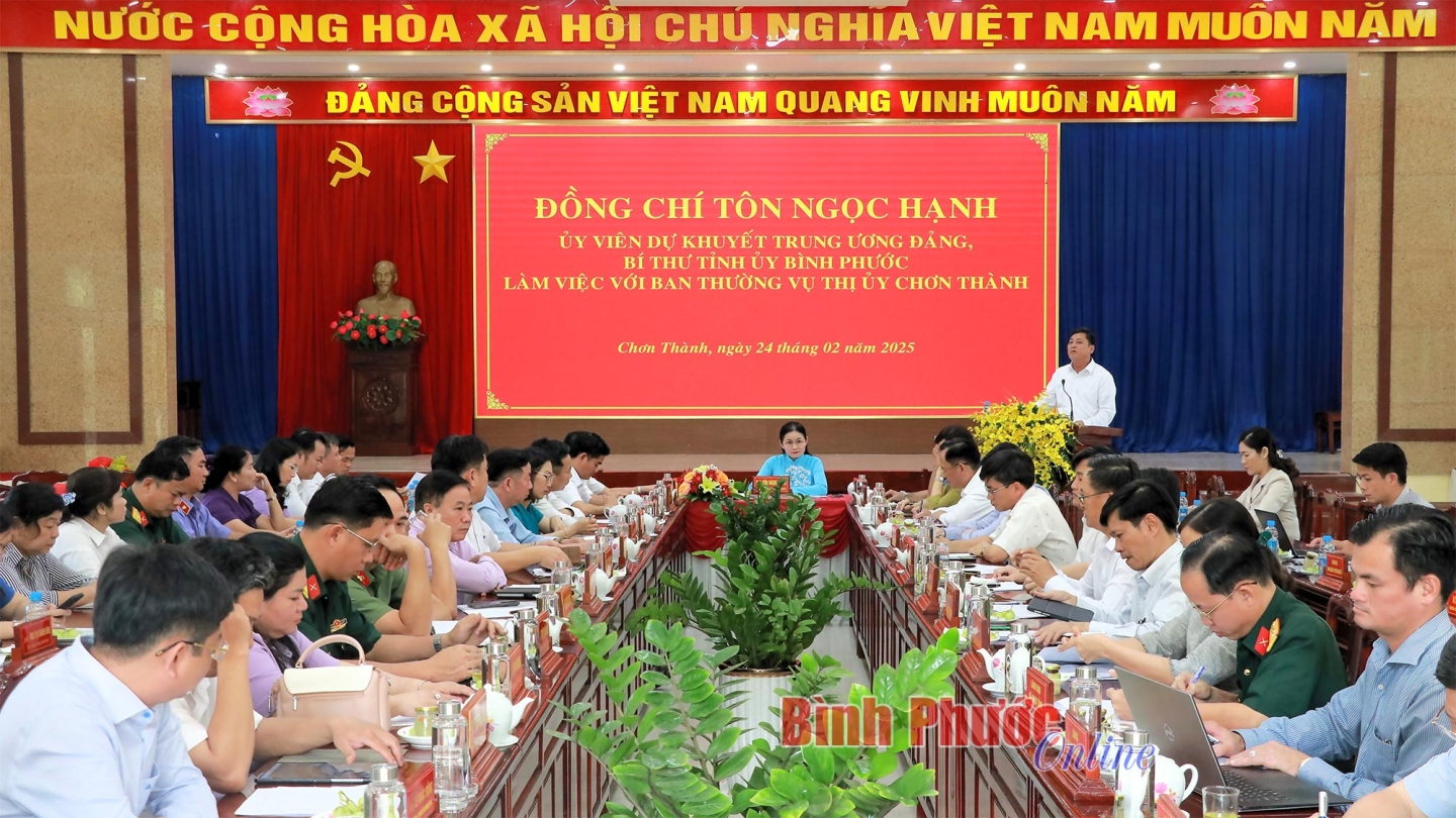 Ủy viên dự khuyết Trung ương Đảng, Bí thư Tỉnh ủy Tôn Ngọc Hạnh chủ trì buổi làm việc. Cùng dự có các Ủy viên Ban Thường vụ Tỉnh ủy: Nguyễn Hồng Trà, Trưởng Ban Tổ chức Tỉnh ủy; Trần Tuyết Minh, Phó Chủ tịch UBND tỉnh; đại diện lãnh đạo các sở, ban, ngành của tỉnh và thị xã Chơn Thành.