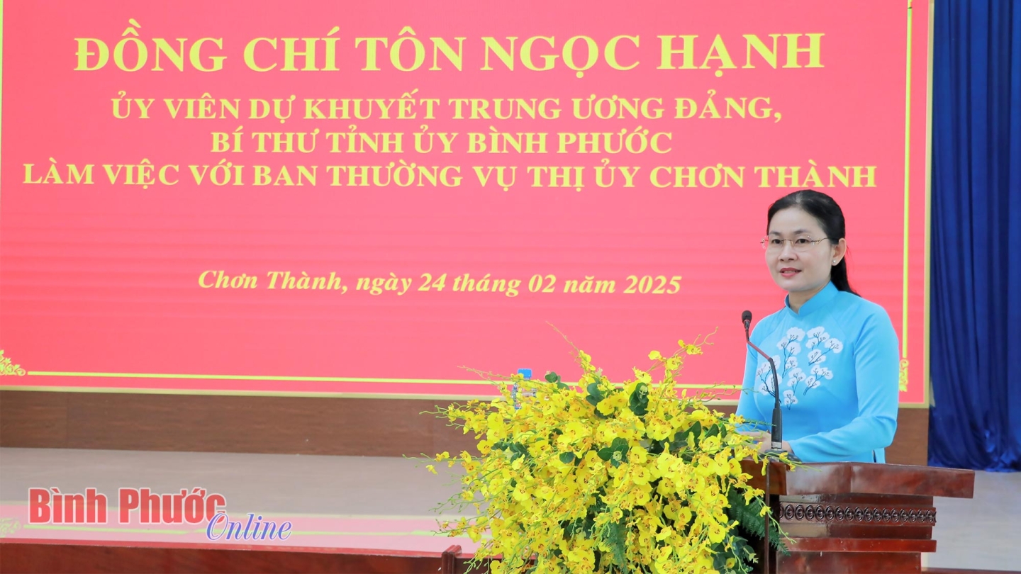 Tại buổi làm việc, Bí thư Tỉnh ủy Tôn Ngọc Hạnh nhấn mạnh: Đối với thị xã Chơn Thành, lãnh đạo tỉnh luôn đặt ra yêu cầu cao hơn so với các địa phương khác. Do đó thời gian tới, các đồng chí trong Ban Chấp hành, Ban Thường vụ, Thường trực Thị ủy phải phát huy tinh thần đoàn kết cao độ, cùng nhau bàn các giải pháp tháo gỡ những khó khăn vướng mắc đã được chỉ ra tại buổi làm việc.