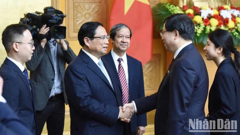 Thủ tướng Chính phủ Phạm Minh Chính bắt tay chào mừng Bí thư Đảng ủy Đại học Thanh Hoa (Trung Quốc) Khưu Dũng. (Ảnh: TRẦN HẢI)
