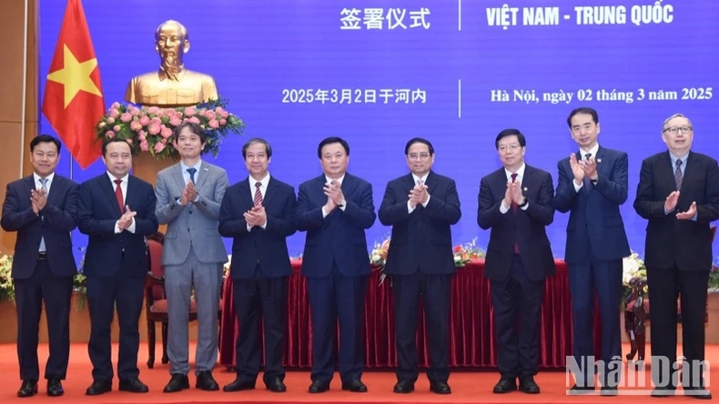 Thủ tướng Phạm Minh Chính với các đại biểu Việt Nam và Trung Quốc tham dự buổi lễ. (Ảnh: TRẦN HẢI)