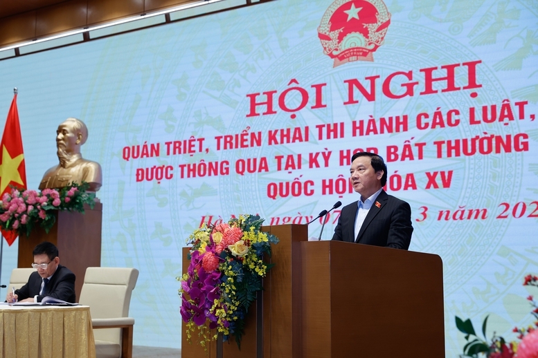 Tại Hội nghị, Phó Chủ tịch Quốc hội Nguyễn Khắc Định quán triệt nội dung về kết quả hoàn thiện thể chế về tổ chức bộ máy để thực hiện sắp xếp, tinh gọn tổ chức bộ máy.