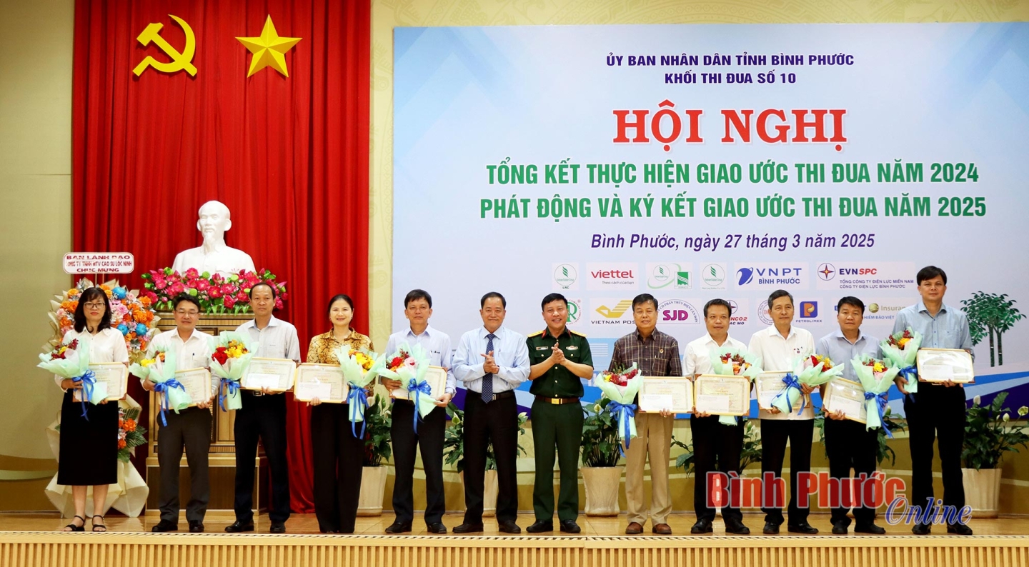 Dịp này, UBND tỉnh tặng bằng khen cho Công ty TNHH MTV Cao su Lộc Ninh và Công ty Cổ phần Thủy điện Thác Mơ đã có thành tích xuất sắc trong phong trào thi đua của khối. Công ty Cổ phần Thủy điện Cần Đơn cũng được UBND tỉnh tặng bằng khen theo chuyên đề vượt chỉ tiêu doanh thu. Khối thi đua số 10 cũng trao tặng giấy khen cho các đơn vị thành viên trong khối, đồng thời trao cờ luân lưu cho Viettel Bình Phước làm khối trưởng năm 2025.