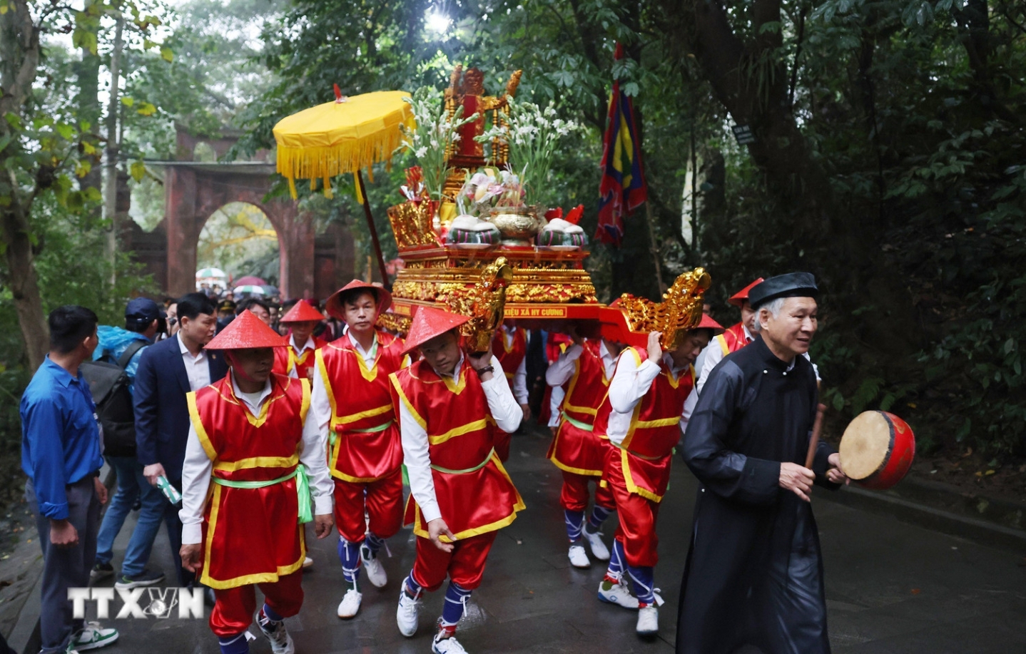 Đoàn dâng hương khởi hành lên núi Nghĩa Lĩnh. (Ảnh: Quốc Khánh/TTXVN)
