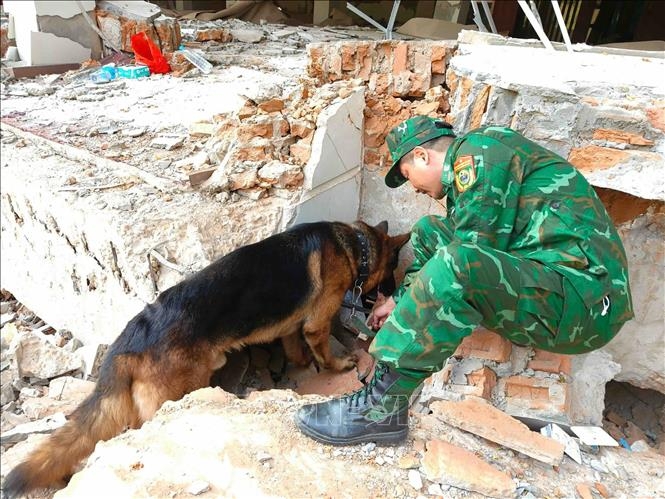 Đội chó nghiệp vụ đến hiện trường để tìm kiếm các vị trí có nạn nhân động đất bị mắc kẹt. Ảnh: TTXVN