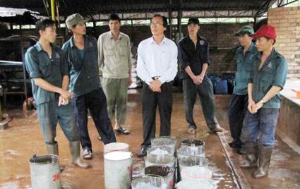 Cán bộ nông trường và công ty trao đổi công việc với công nhân lao động sau giờ nộp mủ