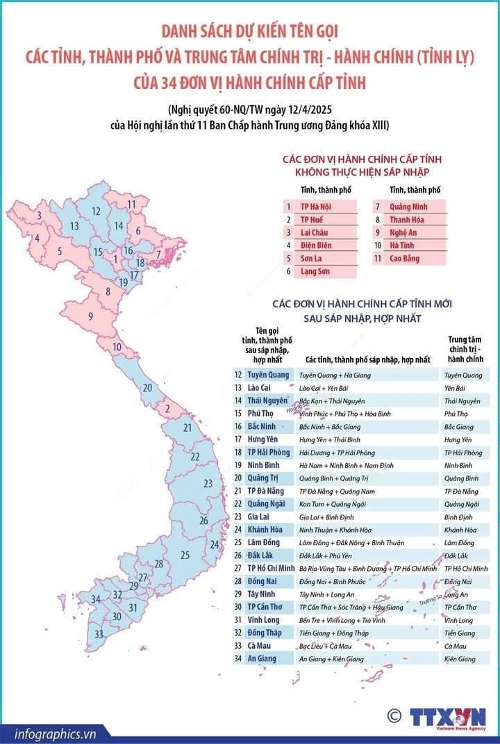 Tại Nghị quyết số 60-NQ/TW Hội nghị lần thứ 11 Ban Chấp hành Trung ương Đảng khóa XIII ngày 12-4-2025, Ban Chấp hành Trung ương Đảng dự kiến các địa phương không sáp nhập và sáp nhập như sau: