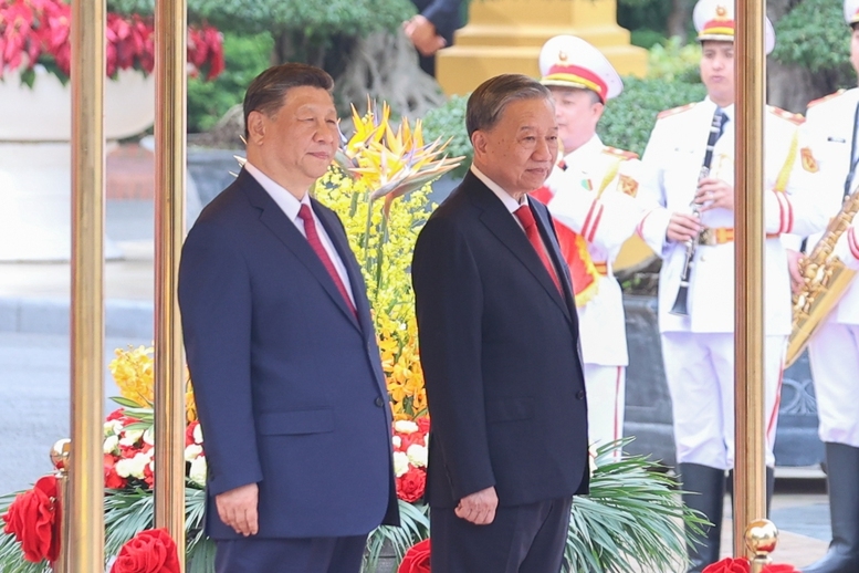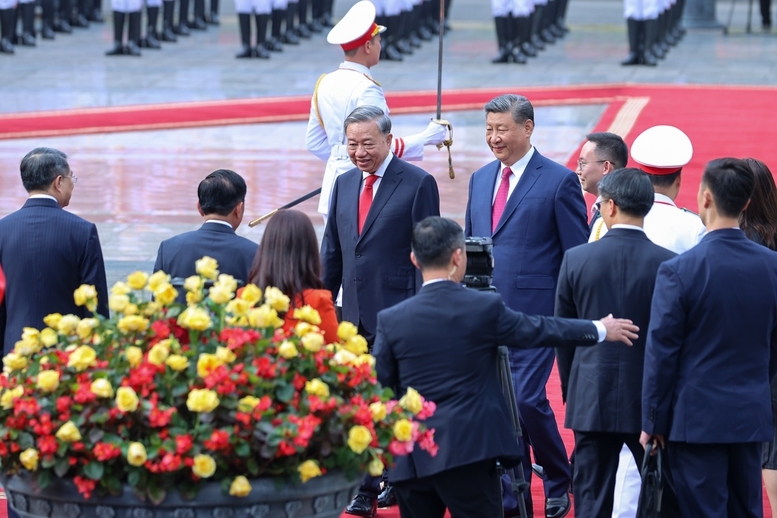 Trong tiếng nhạc chào mừng, Tổng Bí thư Tô Lâm mời Tổng Bí thư, Chủ tịch nước Trung Quốc Tập Cận Bình bước lên bục danh dự. Quân nhạc cử Quốc thiều Trung Quốc và Việt Nam đồng thời 21 phát đại bác chào mừng được bắn từ Hoàng thành Thăng Long trong Lễ đón. Sau khi nghe Quốc thiều hai nước, Tổng Bí thư Tô Lâm và Tổng Bí thư, Chủ tịch nước Trung Quốc Tập Cận Bình rời bục danh dự, bước tới cúi chào quân kỳ và duyệt Đội Danh dự Quân đội nhân dân Việt Nam. Tiếp đó, hai nhà lãnh đạo giới thiệu thành phần Đoàn cấp cao hai nước tham dự Lễ đón.
