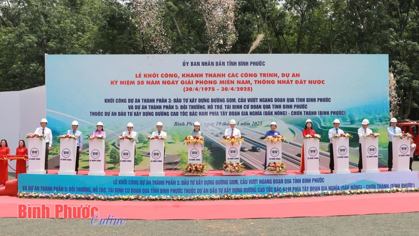 Trước đó, ngày 19-4, UBND tỉnh Bình Phước đã tổ chức lễ khởi công Dự án thành phần 3 “Đầu tư xây dựng đường gom, cầu vượt ngang đoạn qua tỉnh Bình Phước” và Dự án thành phần 5 “Bồi thường, hỗ trợ, tái định cư đoạn qua tỉnh Bình Phước” thuộc Dự án đầu tư xây dựng đường cao tốc Bắc - Nam phía Tây, đoạn Gia Nghĩa (Đắk Nông) - Chơn Thành (Bình Phước).
