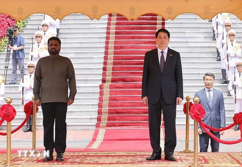 Chủ tịch nước Lương Cường và Tổng thống Sri Lanka Anura Kumara Dissanayaka trên bục danh dự, nghe quân nhạc cử Quốc thiều hai nước. (Ảnh: Lâm Khánh/TTXVN)
