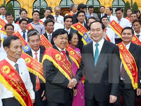 Chủ tịch nước Trần Đại Quang với các đại biểu tại buổi gặp mặt. (Ảnh: Nhan Sáng/TTXVN)