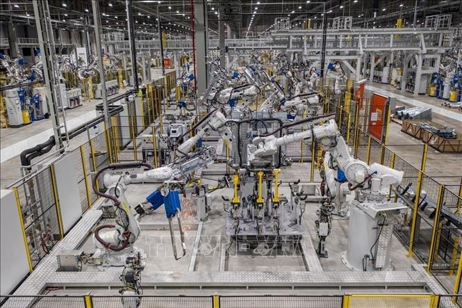 Việc VinFast tự sản xuất và xuất khẩu ô tô điện sang nhiều thị trường nước ngoài từng bước khẳng định vị thế của Việt Nam trên bản đồ công nghiệp sản xuất ô tô của thế giới. Ảnh: TTXVN