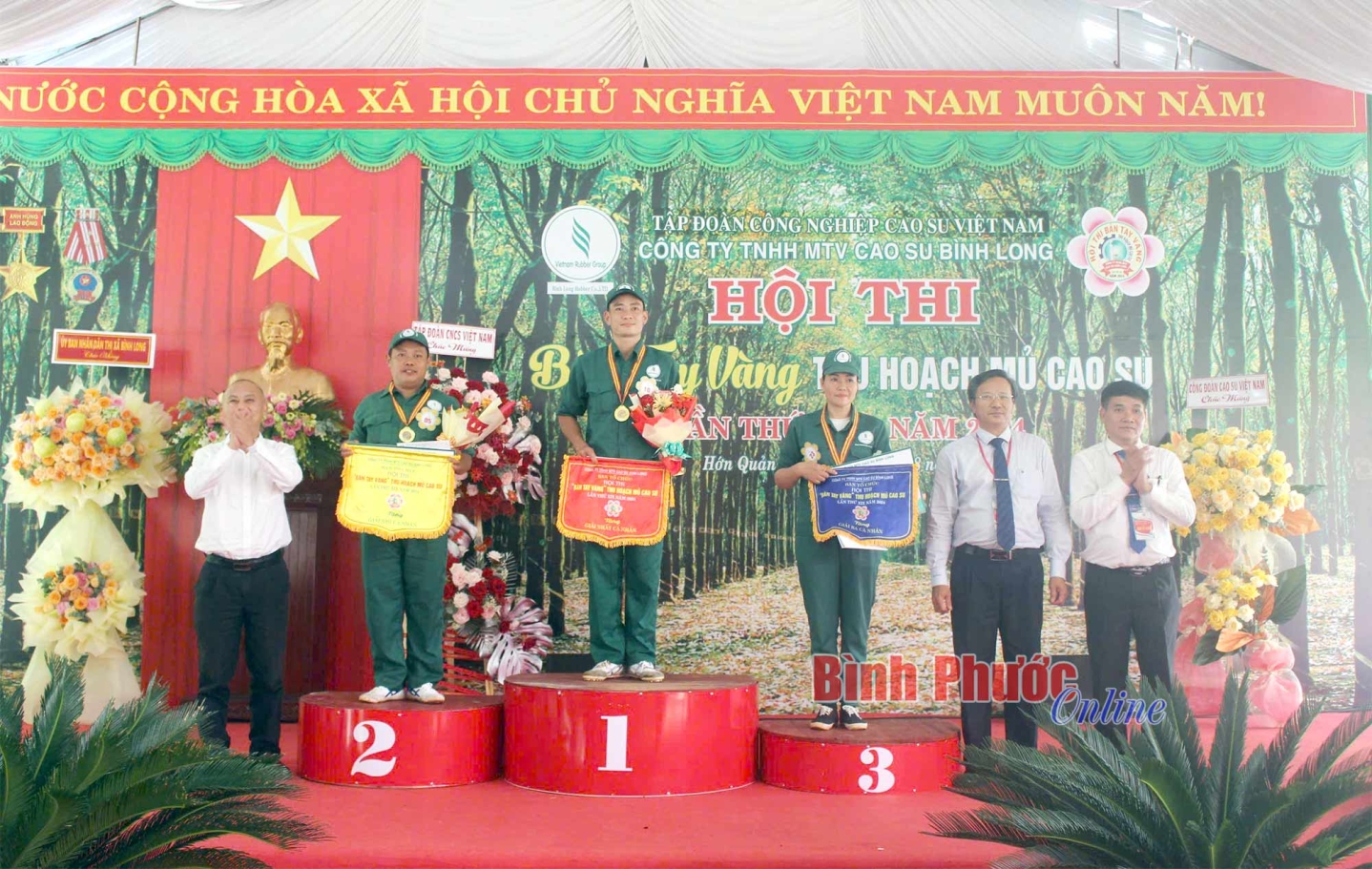 Lãnh đạo Tập đoàn Công nghiệp cao su Việt Nam, công ty trao giải cho các cá nhân tại Hội thi “Bàn tay vàng” thu hoạch mủ cao su năm 2024