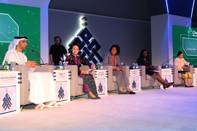 Phát biểu tại phiên thảo luận, Chủ tịch Quốc hội Nguyễn Thị Kim Ngân gửi lời chào trân trọng nhất tới Ngài Chủ tịch IPU, Bà Chủ tịch Hội đồng quốc gia liên bang UAE và các vị Chủ tịch 50 cơ quan lập pháp quốc gia trên thế giới.