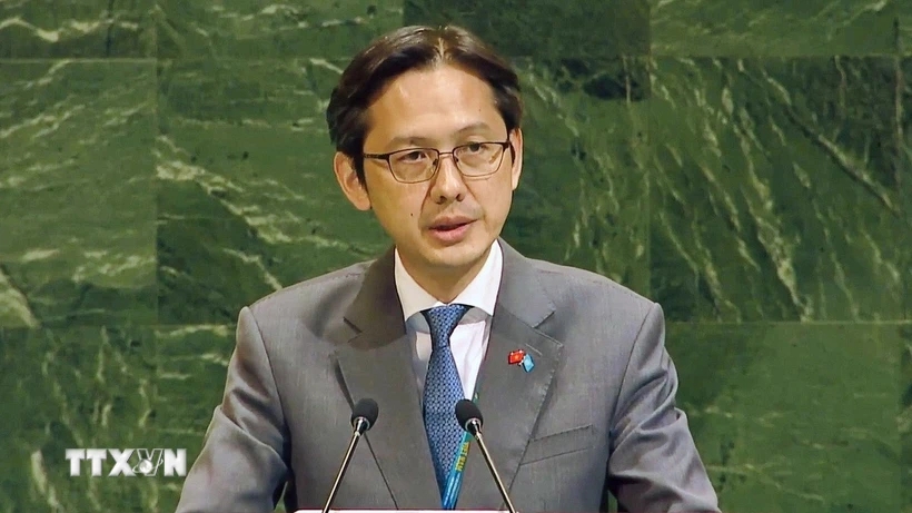 Đại sứ Đỗ Hùng Việt, Trưởng Phái đoàn thường trực Việt Nam tại Liên hợp quốc, phát biểu tại phiên toàn thể. (Ảnh: Thanh Tuấn/TTXVN)