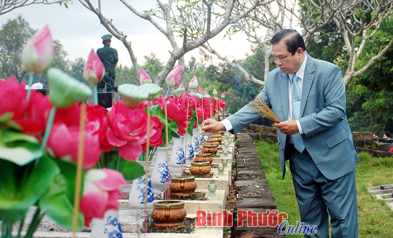 Trong không khí trang nghiêm của buổi lễ, các đoàn đã đến đặt vòng hoa và dâng hương bày tỏ lòng thành kính, biết ơn sâu sắc đối với các anh hùng liệt sĩ đã hy sinh vì sự nghiệp xây dựng và bảo vệ Tổ quốc. Đại biểu dự lễ đã kính cẩn nghiêng mình tưởng nhớ các anh hùng liệt sĩ, đồng bào, đồng chí đã anh dũng hy sinh vì sự nghiệp giải phóng dân tộc, thống nhất đất nước. Sau lễ viếng, đại biểu và nhân dân thắp nhang lên phần mộ các liệt sĩ.