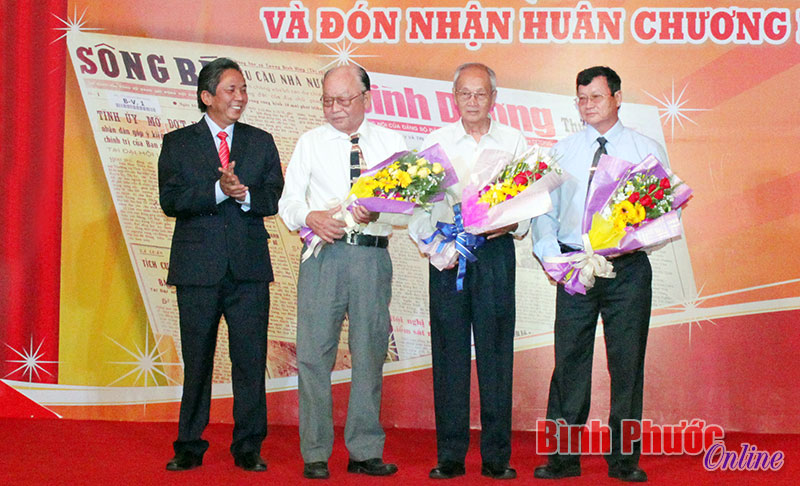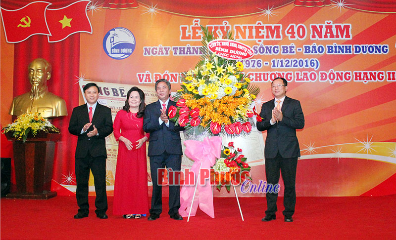 Ông Nguyễn Hữu Từ (bìa phải), Phó Bí thư Tỉnh ủy tặng lẵng hoa chúc mừng tập thể cán bộ, nhân viên Báo Bình Dương nhân dịp kỷ niệm 40 năm Ngày thành lập Báo Sông Bé - Báo Bình Dương và đón nhận Huân chương Lao động hạng II