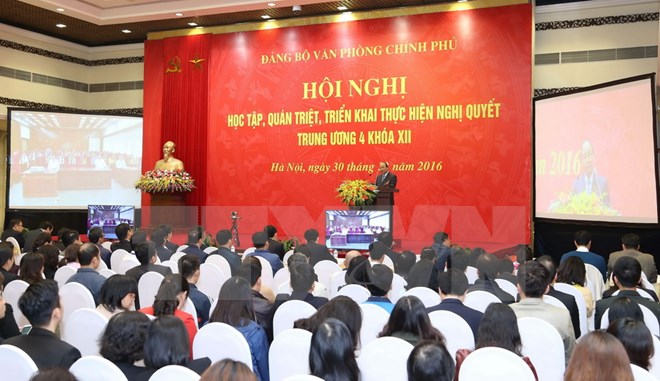 Nhấn mạnh vai trò, vị trí của Văn phòng Chính phủ là cơ quan tham mưu tổng hợp, giúp việc trực tiếp cho Chính phủ, Thủ tướng Chính phủ, Thủ tướng nêu rõ, cả 3 Nghị quyết được Hội nghị Trung ương 4 khóa XII ban hành đều rất quan trọng, nhưng Đảng bộ Văn phòng Chính phủ cần nghiên cứu kỹ hơn Nghị quyết về tăng cường xây dựng, chỉnh đốn Đảng; ngăn chặn, đẩy lùi sự suy thoái về tư tưởng chính trị, đạo đức, lối sống, những biểu hiện “tự diễn biến,” “tự chuyển hóa” trong nội bộ.