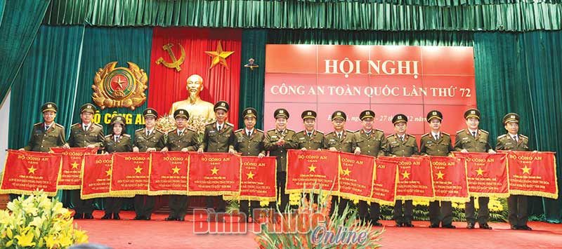 Thứ trưởng Bùi Văn Thành trao cờ thi đua xuất sắc của Bộ Công an tặng công an các đơn vị, địa phương (Đại tá Trần Thắng Phúc Giám đốc Công an tỉnh Bình Phước đứng thứ 5 từ phải qua)