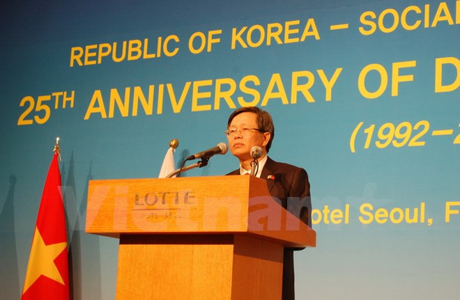 Đại sứ Việt Nam tại Hàn Quốc Phạm Hữu Chí phát biểu tại buổi lễ. (Ảnh: Vũ Toàn-Hữu Tuyên-Vietnam+)Đây là hoạt động mở đầu cho chuỗi sự kiện được tổ chức trong năm nay để kỷ niệm 25 năm ngày thiết lập quan hệ ngoại giao song phương (22-12-1992 - 22-12-2017).