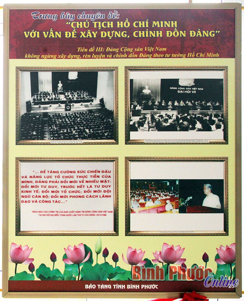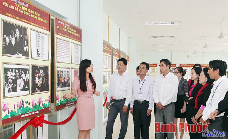 Các tài liệu, hiện vật được sắp xếp, trưng bày theo 4 tiêu đề: Chủ tịch Hồ Chí Minh - Người sáng lập Đảng Cộng sản Việt Nam; Chủ tịch Hồ Chí Minh với vấn đề xây dựng, chỉnh đốn Đảng; Đảng Cộng sản Việt Nam không ngừng xây dựng, rèn luyện và chỉnh đốn Đảng theo tư tưởng Hồ Chí Minh; Đảng bộ tỉnh Bình Phước không ngừng xây dựng, chỉnh đốn Đảng theo tư tưởng Hồ Chí Minh. Những hình ảnh, hiện vật trưng bày đã đem lại cho người xem nhiều cảm xúc sâu sắc.