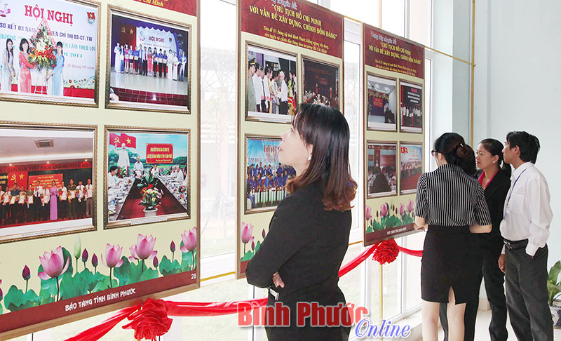 Khách tham quan tại khu vực trưng bày tiêu đề “Đảng bộ tỉnh Bình Phước không ngừng xây dựng, chỉnh đốn Đảng theo tư tưởng Hồ Chí Minh”