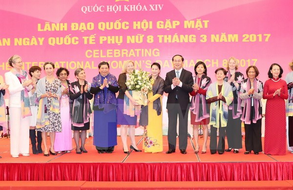 Chủ tịch nước Trần Đại Quang và Chủ tịch Quốc hội Nguyễn Thị Kim Ngân chụp ảnh lưu niệm với các đại biểu tại buổi gặp mặtPhát biểu tại buổi gặp mặt, thay mặt Lãnh đạo Quốc hội Việt Nam, Chủ tịch Quốc hội Nguyễn Thị Kim Ngân gửi tới các nữ lãnh đạo Đảng, Nhà nước, các thành viên Nhóm nữ đại biểu Quốc hội Việt Nam, nữ Đại sứ, nữ Trưởng đại diện các tổ chức quốc tế tại Việt Nam cùng toàn thể các vị khách quý tham dự cuộc gặp mặt lời chúc mừng nồng nhiệt nhất nhân dịp kỷ niệm Ngày quốc tế phụ nữ 8-3; đồng thời bày tỏ sự cảm ơn và tôn vinh những phụ nữ ưu tú, những người đã góp phần không nhỏ vào thành công chung và cho mối quan hệ hợp tác cùng phát triển giữa Việt Nam và cộng đồng quốc tế.