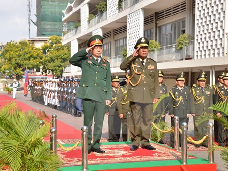 Theo phóng viên tại Phnom Penh, sau lễ đón chính thức tại trụ sở Bộ Tổng Tư lệnh Quân đội Hoàng gia Campuchia sáng 18-3, hai đoàn đã tiến hành hội đàm.