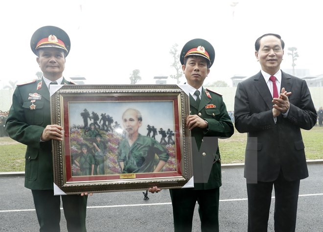 Chủ tịch nước Trần Đại Quang trao tặng bức tranh 'Bác vẫn cùng chúng cháu hành quân' cho Bộ Tư lệnh Binh chủng Đặc công. (Ảnh: Nhan Sáng/TTXVN)