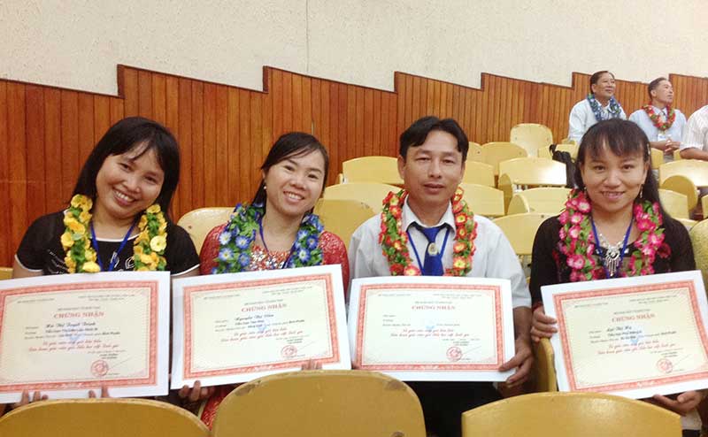 Cô Lại Thị Hà (bên trái) nhận bằng khen giáo viên giỏi cấp quốc gia