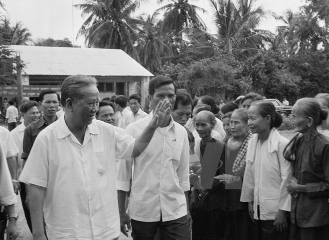 Tổng Bí thư Lê Duẩn thăm cán bộ, nhân dân xã Nhơn Hưng - xã Anh hùng của huyện Tịnh Biên (tỉnh An Giang) có nhiều thành tích trong chiến đấu chống Khmer Đỏ của chế độ diệt chủng Pol Pot (Campuchia), bảo vệ biên giới Tây Nam
