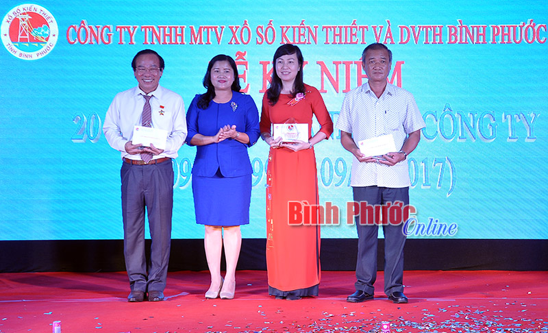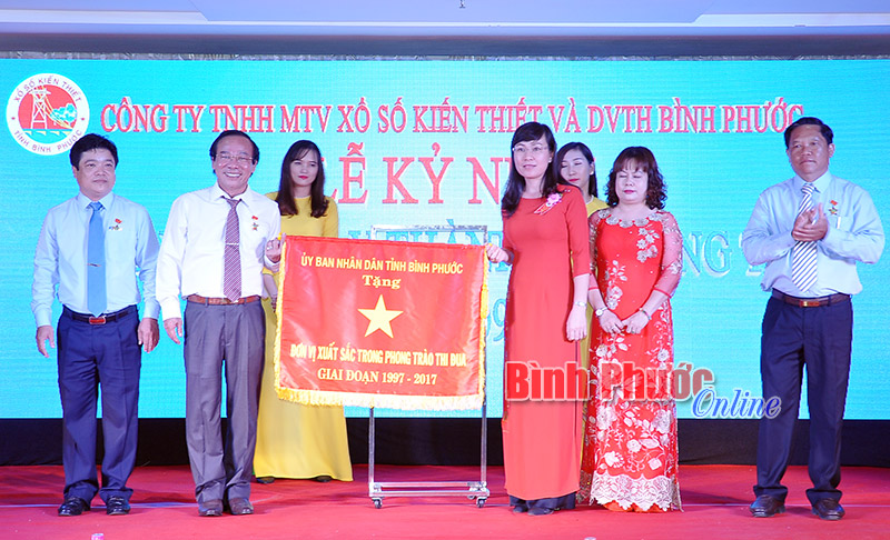 Phó chủ tịch thường trực UBND tỉnh, Ủy viên Ban Thường vụ Tỉnh ủy Huỳnh Thị Hằng tặng cờ thi đua xuất sắc giai đoạn 1997-2017 cho Công ty TNHH MTV xổ số kiến thiết và dịch vụ tổng hợp Bình Phước