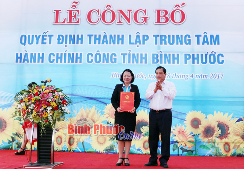 Phó bí thư Tỉnh ủy, Chủ tịch UBND tỉnh Nguyễn Văn Trăm trao quyết định thành lập cho đồng chí Phạm Thị Ánh Hoa, Giám đốc Trung tâm Hành chính công - Ảnh: Sỹ Hòa