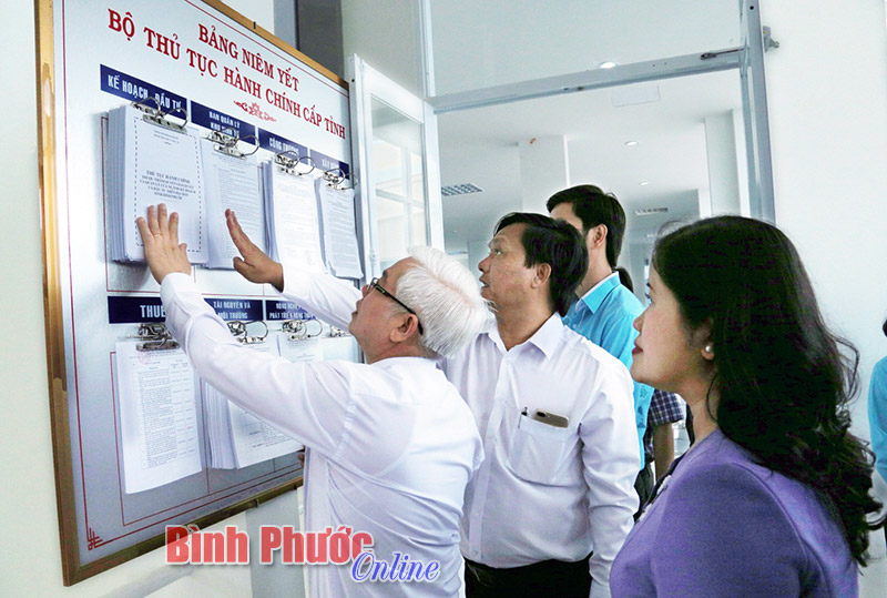 Các đồng chí: Nguyễn Văn Lợi, Ủy viên Trung ương Đảng, Bí thư Tỉnh ủy; Trần Tuệ Hiền, Phó bí thư Thường trực Tỉnh ủy, Chủ tịch HĐND tỉnh và lãnh đạo tỉnh kiểm tra bảng niêm yết bộ thủ tục hành chính cấp tỉnh - Ảnh: Sỹ Hòa