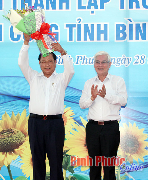 Đồng chí Nguyễn Văn Lợi, Ủy viên Trung ương Đảng, Bí thư Tỉnh ủy, Trưởng đoàn Đại biểu Quốc hội tỉnh tặng hoa chúc mừng Chủ tịch UBND tỉnh Nguyễn Văn Trăm tại lễ công bố quyết định thành lập Trung tâm Hành chính công
