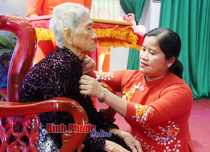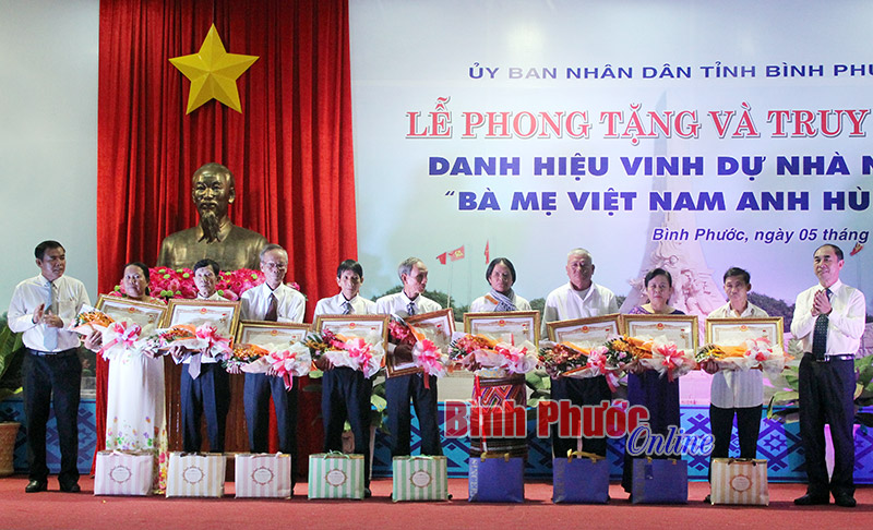 Tại buổi lễ, thừa ủy quyền của Chủ tịch nước, đồng chí Trần Tuệ Hiền đã trao bằng, huy hiệu “Bà mẹ Việt Nam anh hùng” cho mẹ Bùi Thị Năm (SN1929) ở xã Bù Nho, huyện Phú Riềng có 2 con hy sinh và trao tặng bằng, huy hiệu “Bà mẹ Việt Nam anh hùng” cho 17 thân nhân của các mẹ đã mất.