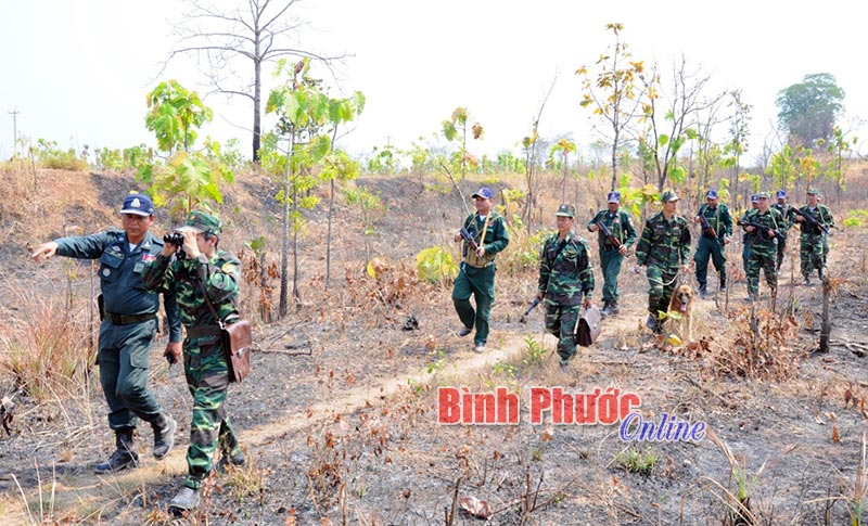 Các chiến sĩ Bộ đội Biên phòng Bình Phước (Việt Nam) phối hợp với lực lượng bảo vệ biên giới tỉnh Karatie (Campuchia) tuần tra bảo vệ đường biên, cột mốc biên giới - Ảnh: H.T