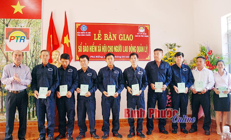 Đại diện Công ty cổ phần đầu tư xây dựng cao su Phú Thịnh trao sổ BHXH cho người lao động