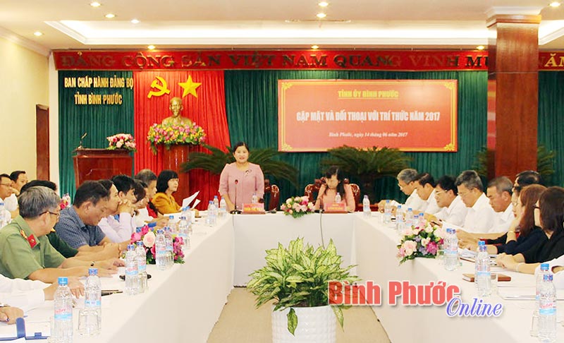 Đồng chí Phó bí thư Thường trực Tỉnh ủy cho biết, đối với chính sách đào tạo, bồi dưỡng, phát triển nguồn nhân lực tỉnh đã có nghị quyết phát triển về nguồn nhân lực trong suốt 2 nhiệm kỳ liên tục và tại kỳ họp HĐND tỉnh giữa năm 2017 cũng sẽ có nghị quyết mới phù hợp, mang tính đột phá trong công tác bồi dưỡng, đào tạo, nâng cao nguồn nhân lực trước nhu cầu hiện nay. Phát triển nông nghiệp là thế mạnh của Bình Phước. Tỉnh đang tập trung phát triển nông nghiệp công nghệ cao, chuyên canh cây ăn trái, rau sạch, nông sản sạch nhằm nâng cao giá trị sản phẩm để tăng tính cạnh tranh trên thị trường. Trong điều kiện kinh tế còn khó khăn, tỉnh kêu gọi nguồn đầu tư từ nhiều phía, từ doanh nghiệp, doanh nhân để đầu tư, nâng cấp thị xã Đồng Xoài. Chúng ta còn nhiều điều trăn trở, ai cũng biết vấn đề an toàn vệ sinh thực phẩm như thế nào, thực trạng cầm cố đất trong vùng đồng bào dân tộc thiểu số ra sao, làm sao huy động sức dân để triệt tiêu các tệ nạn xã hội. Chúng ta đã làm tốt chưa? Làm sao để có điểm bán rau sạch cụ thể, rõ ràng? Những bất cập trong ngành nông nghiệp, y tế, giáo dục, khoa học - công nghệ, trách nhiệm của ai, của ngành nào phải lo, phải cụ thể hóa vấn đề này. Và chúng ta phải làm khẩn trương. Mời các trí thức trong tỉnh tiếp tục đóng góp ý kiến để tạo kênh thông tin giúp tỉnh quản lý tốt hơn. Đội ngũ trí thức của tỉnh phải quan tâm đến thông tin thời sự, đến thời cuộc của tỉnh.