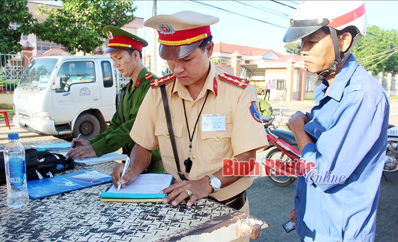 Cảnh sát giao thông kiểm tra, xử lý vi phạm trên quốc lộ 14 đoạn qua thị xã Đồng Xoài