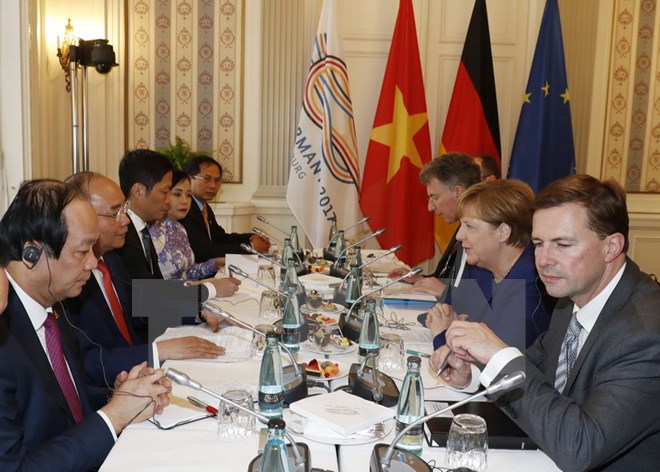 Thủ tướng Chính phủ Nguyễn Xuân Phúc cảm ơn Thủ tướng Angela Merkel đã mời Việt Nam thăm và tham dự Hội nghị Thượng đỉnh G20 tại Hamburg, Đức và dành cho Đoàn đại biểu cấp cao Chính phủ Việt Nam sự đón tiếp chu đáo, trọng thị.