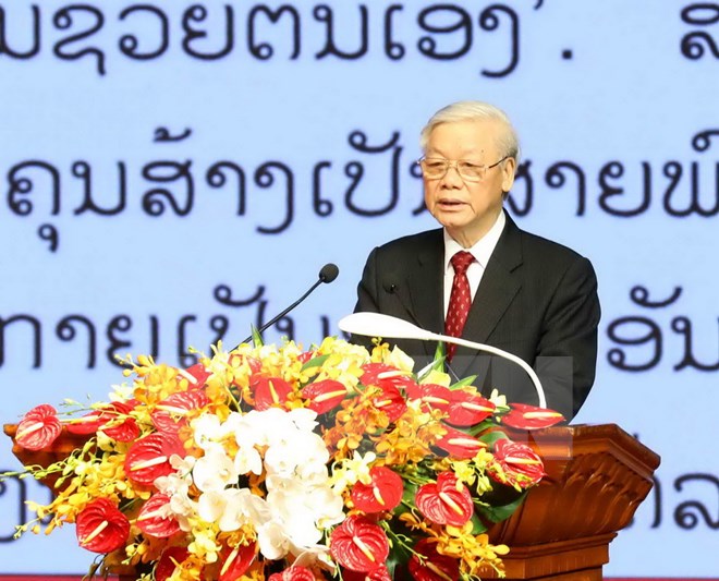 Bày tỏ niềm tự hào về quá trình hình thành và phát triển của mối quan hệ đặc biệt hiếm có giữa hai dân tộc, Tổng Bí thư nhấn mạnh đó là mối quan hệ phát triển bền vững từ quan hệ truyền thống thân thiết trở thành quan hệ đặc biệt do Chủ tịch Hồ Chí Minh đặt nền móng và cùng Chủ tịch Kaysone Phomvihane, Chủ tịch Souphanouvong và các thế hệ lãnh đạo hai Đảng, hai Nhà nước dày công vun đắp.