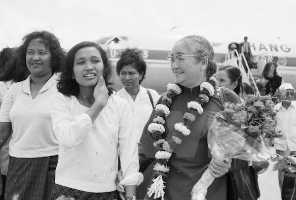Đồng chí Nguyễn Thị Định, Uỷ viên Trung ương Đảng, Chủ tịch Hội Liên hiệp Phụ nữ Việt Nam sang dự Hội nghị Thi đua “5 tốt” toàn quốc lần thứ nhất của Hội Phụ nữ Campuchia (28-2-1985). (Ảnh: Tư liệu TTXVN)