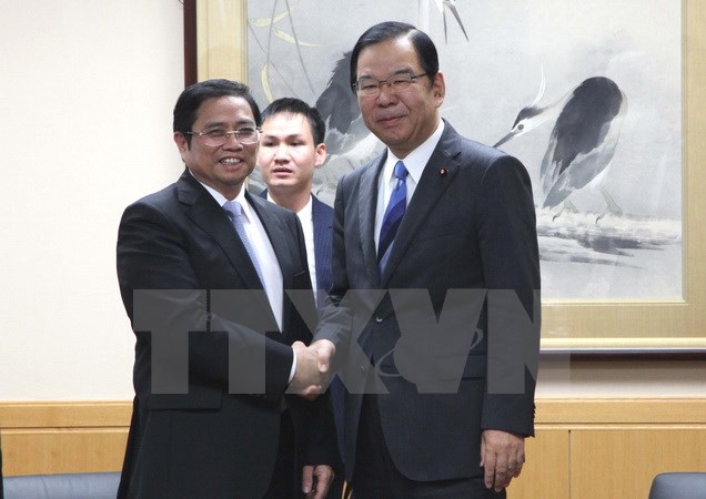 Bí thư Trung ương Đảng Phạm Minh Chính và Chủ tịch Đoàn Chủ tịch Ban Chấp hành Trung ương Đảng Cộng sản Nhật Bản Shii Kazuo.(Ảnh: Cẩm Tuyến/TTXVN)