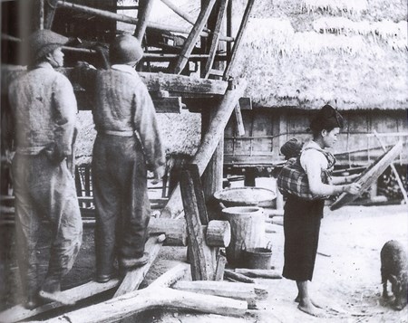 Bộ đội tình nguyện Việt Nam giã gạo giúp nhân dân Lào (Nguồn: Sách ảnh Quan hệ đặc biệt Việt Nam-Lào/Nhà xuất bản Thông tấn)