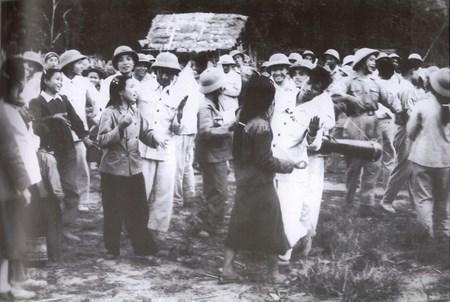 Bộ đội tình nguyện Việt Nam liên hoan chia tay nhân dân các bộ tộc Lào trước khi về nước. (Nguồn: Sách ảnh Quan hệ đặc biệt Việt Nam-Lào/Nhà xuất bản Thông tấn)