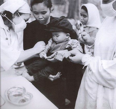 Chiến sỹ quân y tình nguyện Việt Nam phòng chống dịch bệnh trong vùng giải phóng Lào năm 1962. (Nguồn: Sách ảnh Quan hệ đặc biệt Việt Nam-Lào/Nhà xuất bản Thông tấn)